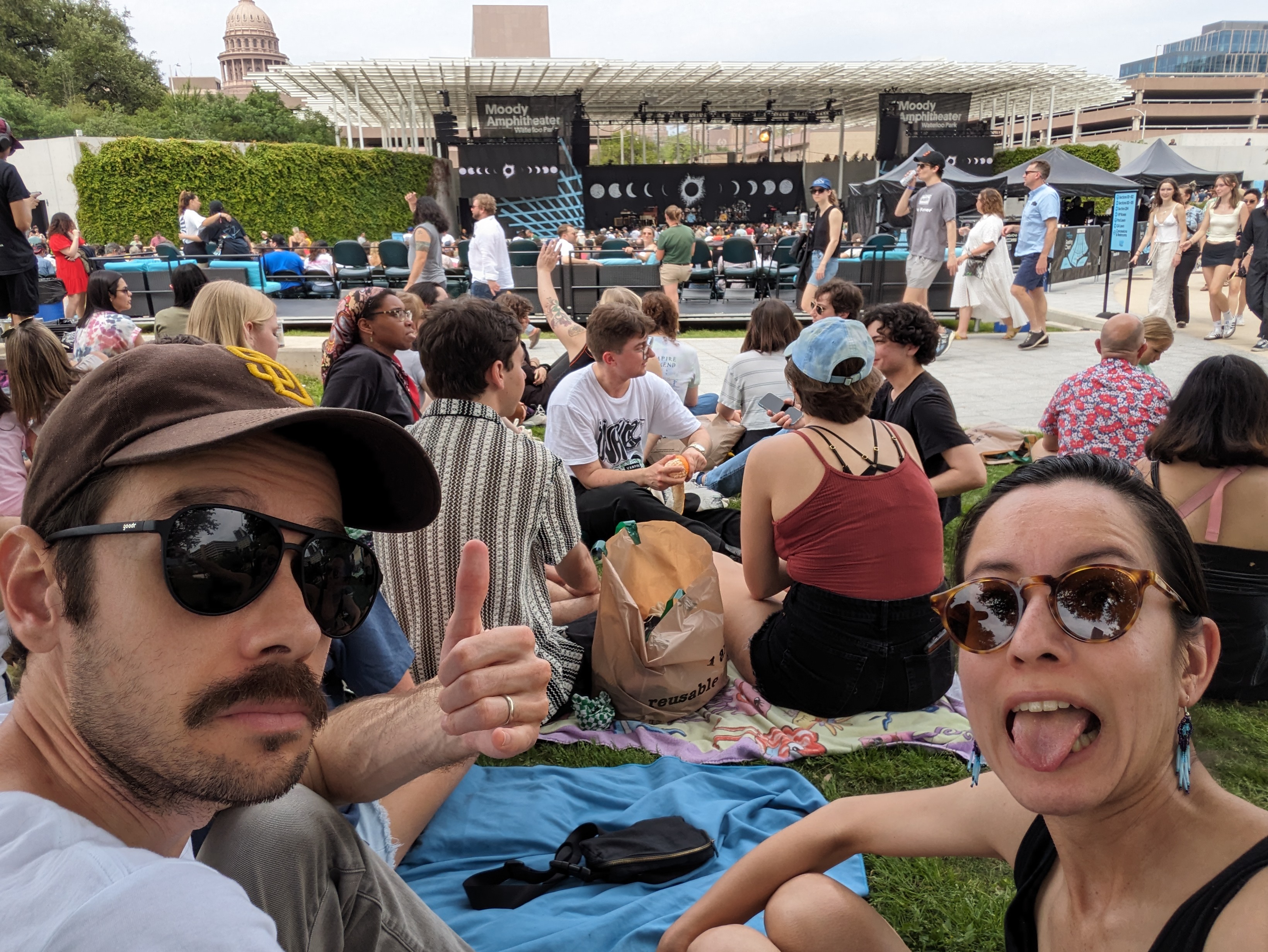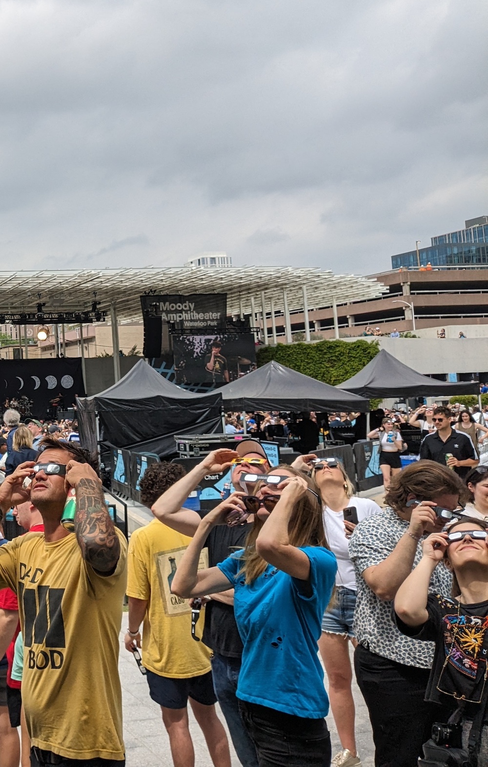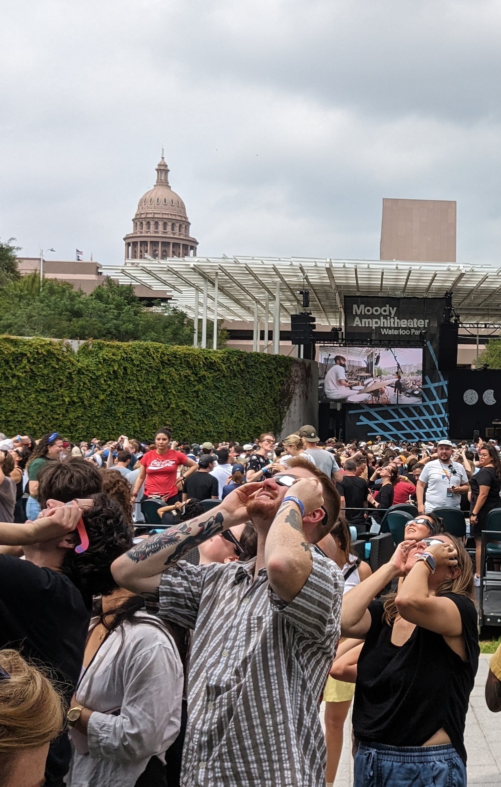 TOTALITY. It sure hits different when you're at the mercy of the cloud gods. Austin was set to get just 1 minute 37 seconds of totality, already a smaller window than the 4+ minutes about 80 miles west. What are the odds that the persistent clouds would break during that 1 minute and 37 seconds? Ezra announced a pause in the show so we could all enjoy the eclipse without distraction, and the band went backstage, presumably to their own private viewing spot. So we all stood there in darkness as totality started, celebrating a sight we couldn't see, a few groups throughout the crowd howling at the sky for entertainment. I think we were all prepared to not see anything, and instead marveled at the eerie quiet of the city while the Capitol and downtown buildings lit up in the "night" sky.