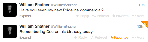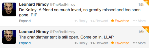 Sometimes Leonard Nimoy and William Shatner's tweets are incredibly silly (well, mostly Shatner's)...but today among the silliness they also paid tribute to DeForest Kelley, which I thought was sweet.