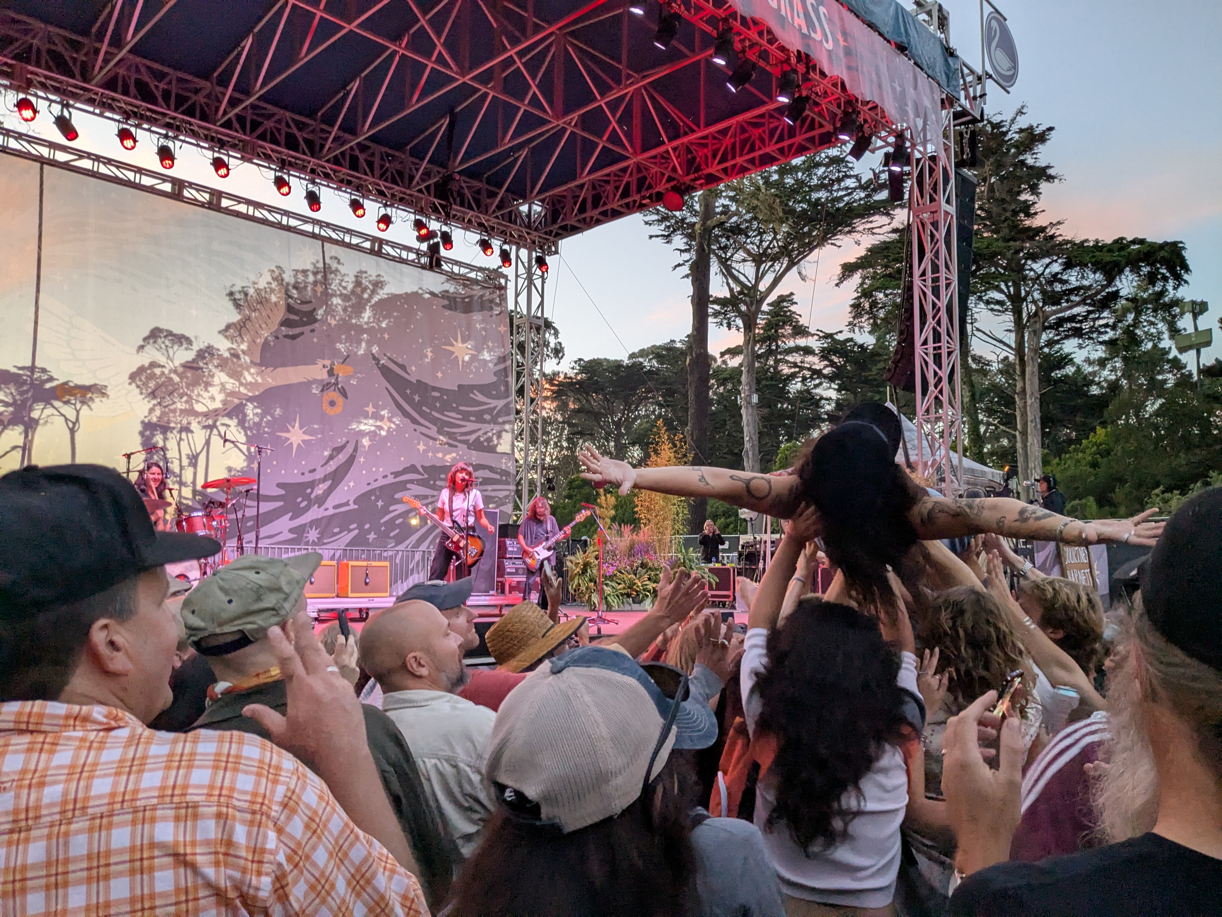 Wholesome moments: a little girl giving Courtney a handwritten note from her mom's shoulders, the almost-full moon coming up behind us, impromptu birthday wishes, more handwritten notes from the crowd ("it feels like high school", as Courtney adds to the pile of notes under her mic stand).
