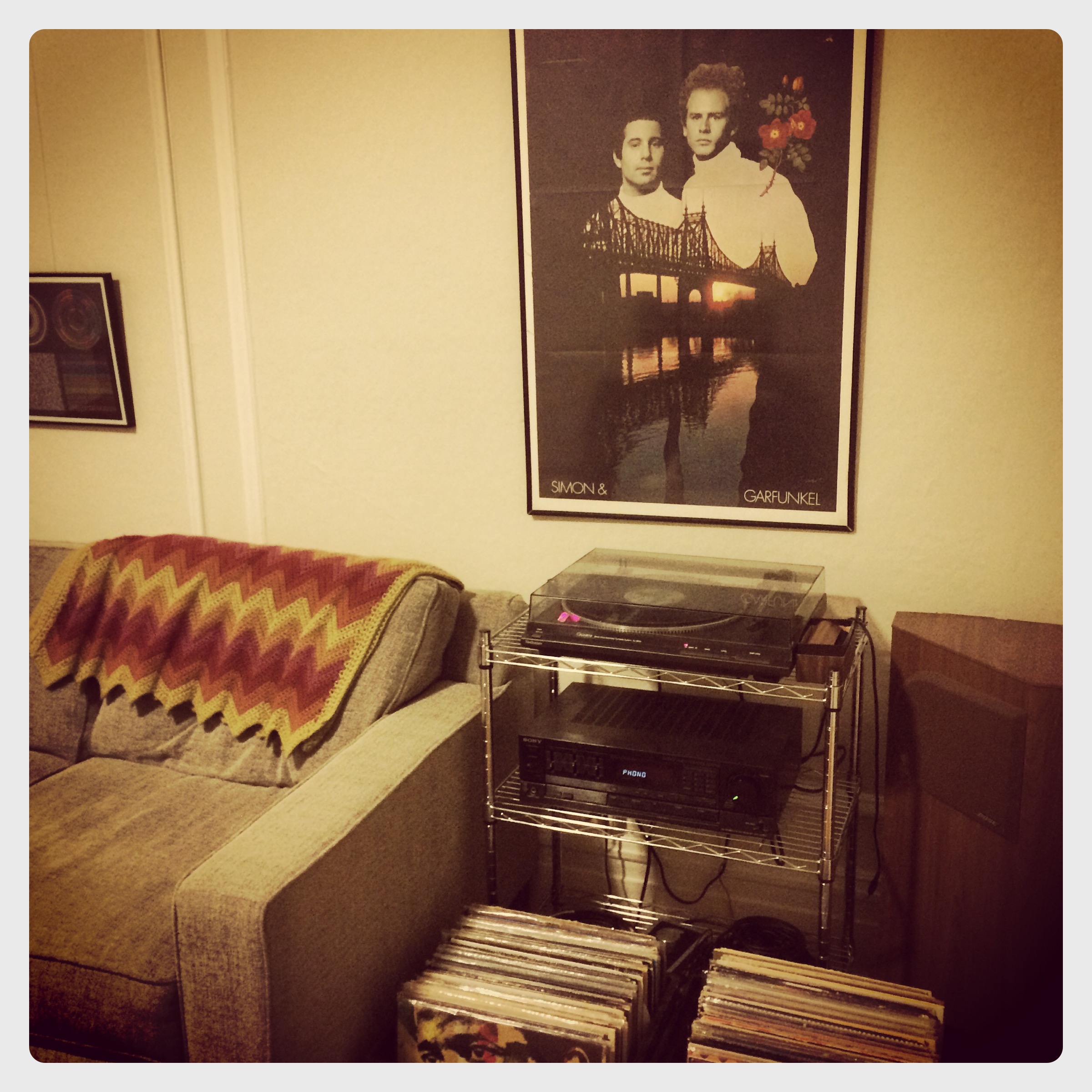 Just look at these gems! That Prince poster was unexpectedly discovered after buying Dirty Minds at Rasputin (oh my gosh, Prince records have the best inserts and posters). And the S&G poster was tucked into a copy of Bookends that I found at a little record store in Lausanne, Switzerland. It's one of my favorite purchases of all time (is there no imagery that better embodies Simon & Garfunkel than the 59th Street Bridge and a sprig of flowers??). So you see, another reason to celebrate the existence of the LP: free life-sized pictures of musical legends, just waiting to get unfolded and put onto a wall.